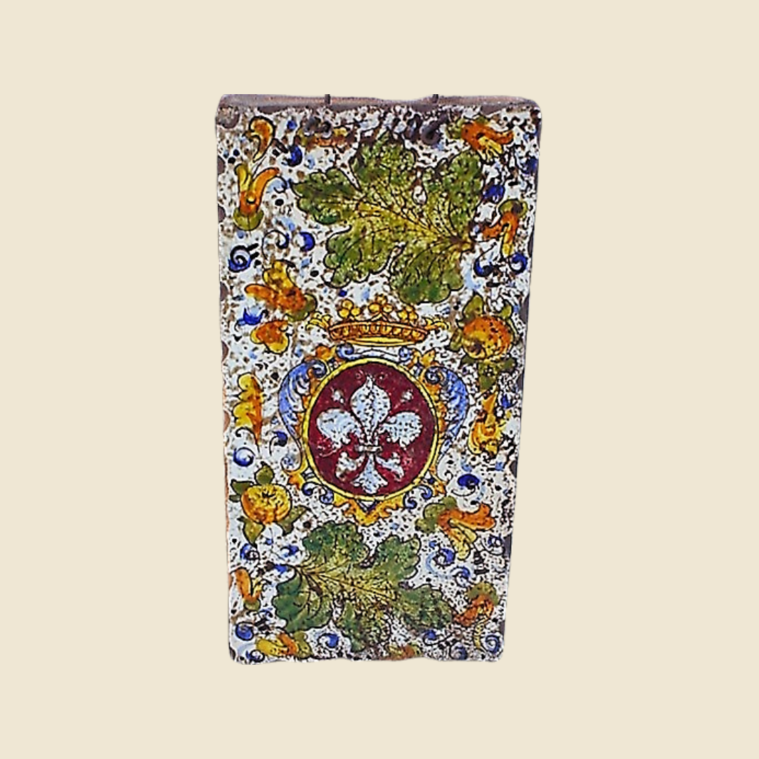 Rectangular tile cm 30 x 15 Cote of ARMS Fleur de Lys – and Cafaggiolo green leaves
