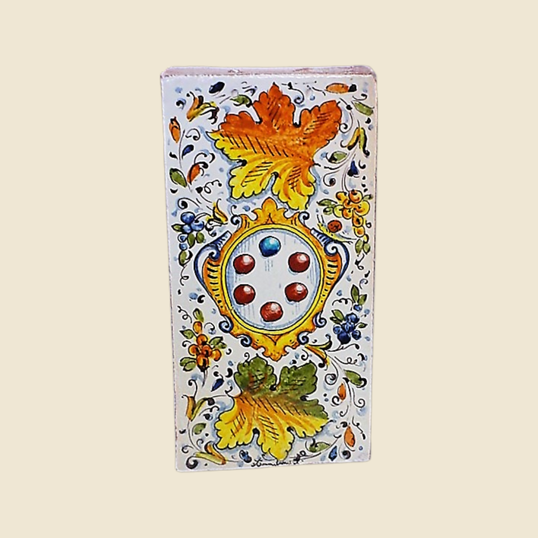 MRectangular tile, commonly called “pianella” – the brick usually used to pave rural structures typical of the Tuscan countryside. Tuscan terracotta, especially from the Impruneta area, is highly appreciated and known for its waterproof characteristics and resistance to low temperatures, in addition to the beautiful terracotta shades; making it unique, recognizable and highly sought after. We use this suffix, with its irregularities, veins, at first glance imperfections of hand-made terracotta; to create artefacts with classic decorations, which come from distant times and places; but it is precisely thanks to these irregularities that our products take on a worn, lived-in appearance that smells of antiquity; these imperfections are like scars that make each individual product unique and unrepeatable.