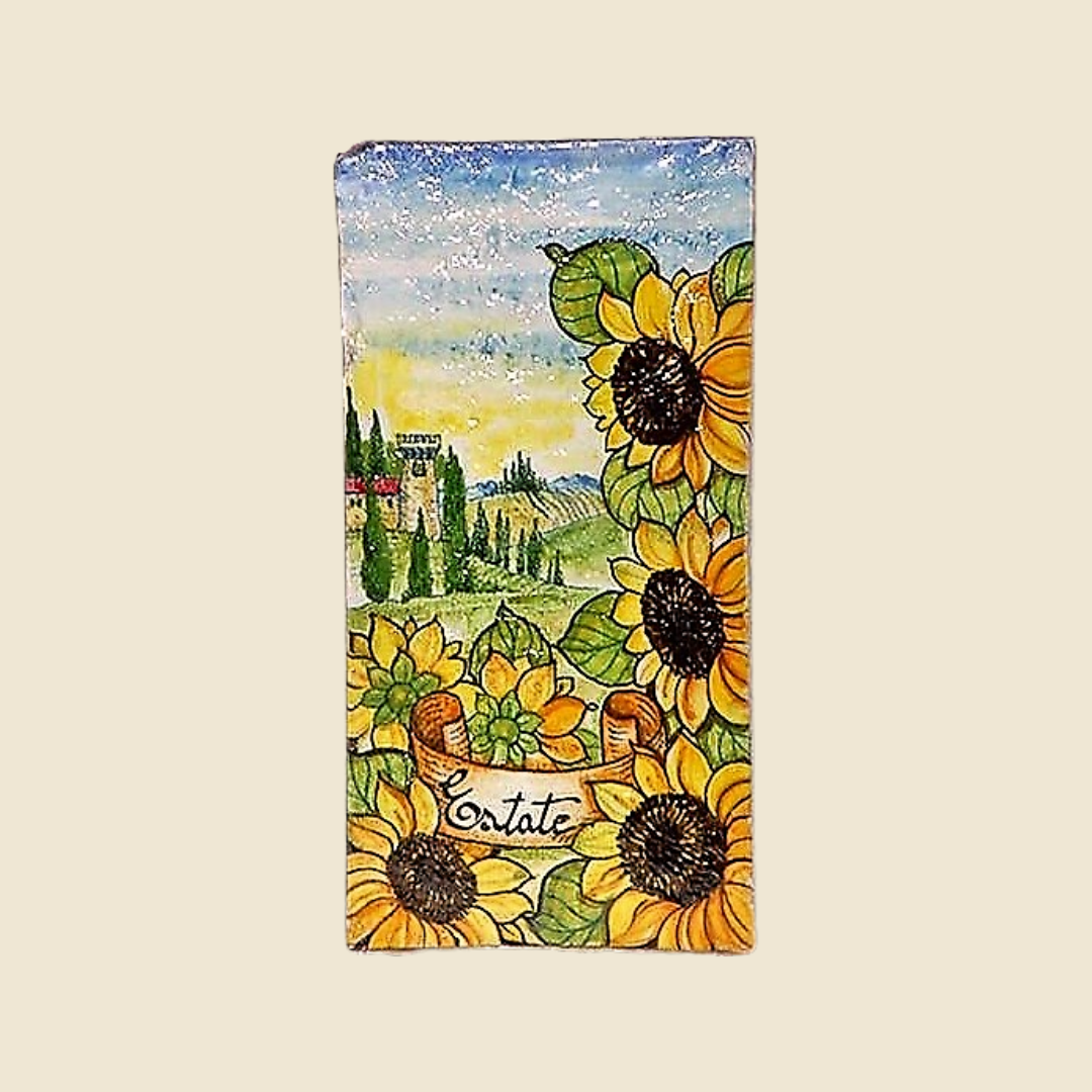 Rectangular tile, commonly called pianella - the brick usually used to pave rural structures typical of the Tuscan countryside. Tuscan terracotta, especially from the Impruneta area, is highly appreciated and known for its waterproof characteristics and resistance to low temperatures, as well as its beautiful terracotta shades; makes it unique, recognizable and highly sought after. We use this suffix, with its irregularities, veins, at first glance imperfections of handmade terracotta; to create artefacts with classic decorations, which come from distant times and places; but it is precisely thanks to these irregularities that our products take on a worn, lived-in appearance that smells of antiquity; these imperfections are like scars that make every single product unique and unrepeatable. The decoration of the landscape in the 4 seasons was created using the colors of the countryside that change according to the seasons and we also combined a subject that represented that period of time. So, for spring we chose "il iris", an iris that grows spontaneously in the Florentine countryside during spring. For the summer we thought that the sunflower could be the most representative, sunniest and brightest subject. For autumn, thanks also to our proximity to the Chianti area, where most of the hills are cultivated with vineyards, we could only choose grapes as the subject. While for the winter we chose olives, we find it to be a very decorative subject that fully represents the Tuscan countryside.