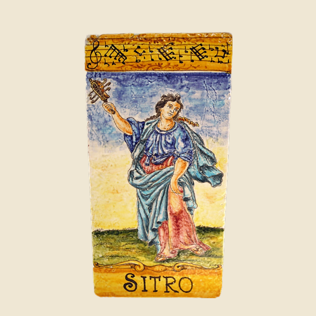 Rectangular tile, commonly called pianella - the brick usually used to pave rural structures typical of the Tuscan countryside. Tuscan terracotta, especially from the Impruneta area, is highly appreciated and known for its waterproof characteristics and resistance to low temperatures, as well as its beautiful terracotta shades; makes it unique, recognizable and highly sought after. We use this suffix, with its irregularities, veins, at first glance imperfections of handmade terracotta; to create artefacts with classic decorations, which come from distant times and places; but it is precisely thanks to these irregularities that our products take on a worn, lived-in appearance that smells of antiquity; these imperfections are like scars that make every single product unique and unrepeatable. The series of bricks dedicated to musicians is a representation of ancient musical instruments that were commonly used during banquets or to celebrate religious and pagan festivals. Many of the tools listed here are no longer in use today, but have been replaced by other tools. We dedicate this series to music, and the tools used to make it accessible; hoping to be able to contribute to keeping alive the memory of instruments that have fallen into disuse.
