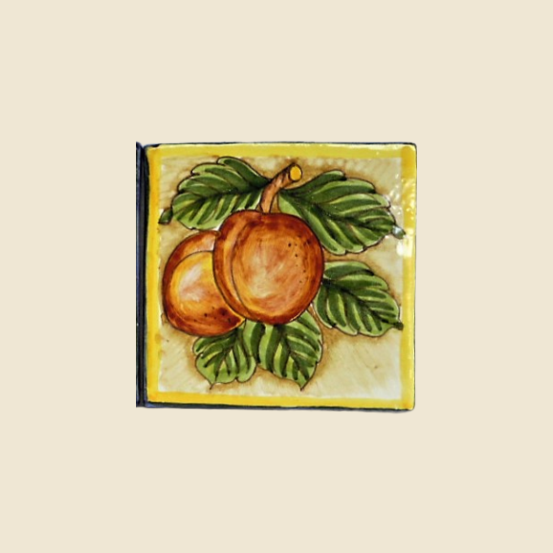 Handmade tile decorated with a fruit motif. Fruit in general has always been a popular subject for ceramics, in particular it goes very well with the rustic environments of farmhouses in the Tuscan countryside; they are often used to embellish environments that have a close relationship with food; such as a kitchen, a cellar or a living room. Fruit always brings a note of color and joy to our homes. Masonry kitchens in particular are often covered with monochrome tiles with some others decorated with various subjects.
