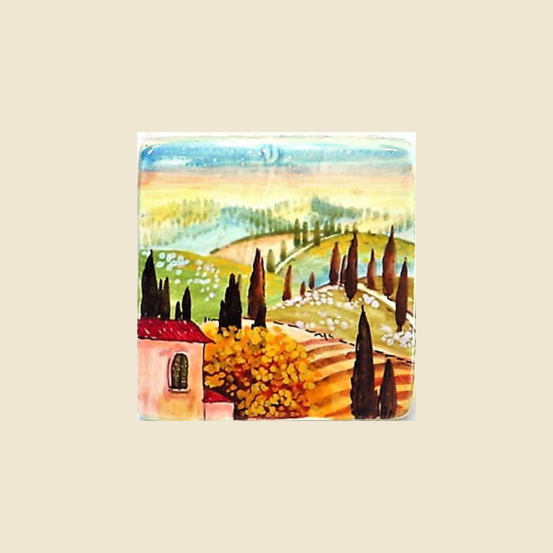Handmade tile decorated with glimpses of panoramic views of the Tuscan countryside. The Tuscan landscape is one of the greatest tourist attractions of recent decades. Tuscany not only offers the visit of beautiful cities full of cathedrals, monuments, churches and artistic works of great importance; but also the Tuscan countryside, with its countless farmhouses, offers the possibility of immersing yourself in an oasis of complete relaxation, in close contact with nature, with its culinary products, the small villages that have remained unchanged despite the passage of time; a pleasant alternative to the cities of art.