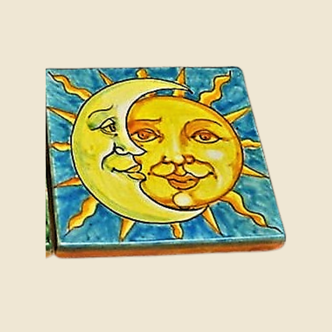 Artistic tile hand-decorated with sun and moon motif, these creations bring a touch of magic and uniqueness to any environment. Each tile is a work of art in its own right, with intricate details that capture the mystical essence of day and night. The bright colors and sinuous lines intertwine to tell stories of balance and cosmic harmony. Perfect for decorating a kitchen, bathroom or a special corner of the home, these tiles not only enrich the space with their beauty, but also evoke a sense of calm and wonder every time you look at them. Choosing these tiles means bringing a piece of sky into your home, a symbol of continuity and rebirth.